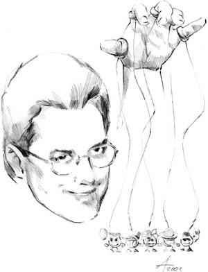Впрочем, оно так всегда бывает, когда художник рисует, ни разу не видя человека в лицо, а перерисовывая с каких-то фотографий. Получается обычно полная бредятина. А ведь я предлагал F5 поставить отличный рисунок художника Тимура Алимова - разумеется, Тимур (в Сети его больше знают под именем Шорох) дал на это свое любезное разрешение. Вот этот рисунок - сравните с тем дурдомом, который поставили в F5.