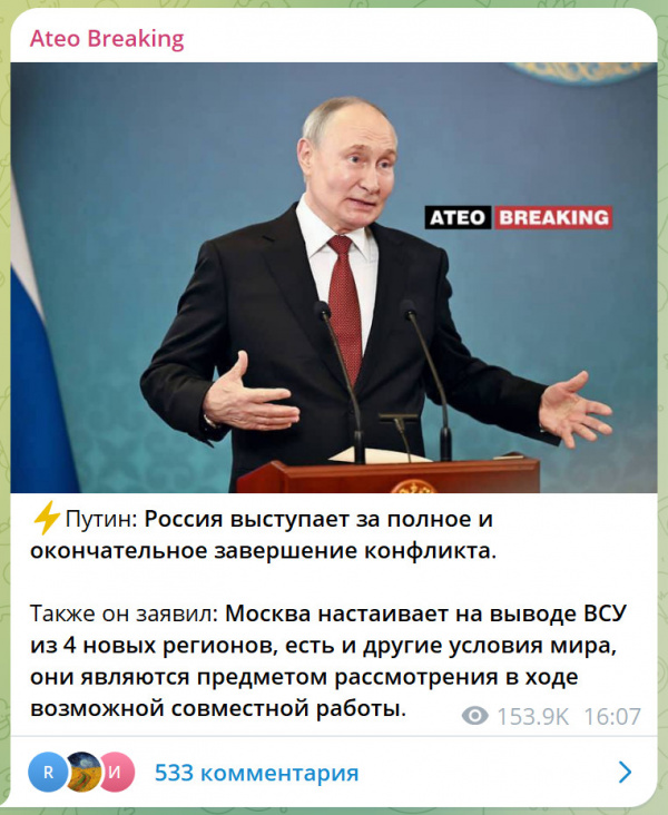 «Я попросил Зеленского подумать о том, нельзя ли сделать иначе: сперва прекратить огонь, а потом вести переговоры о мире. Потому что прекращение огня могло бы обеспечить ускорение темпа этих переговоров», — пересказал Орбан суть своей инициативы после завершения переговоров. (Отсюда.)