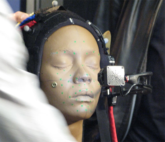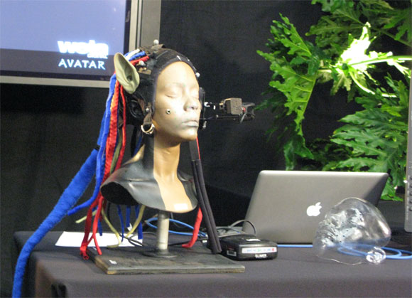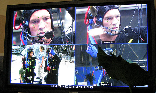 Далее показали процесс обработки съемки реальных актеров и превращение их в пандорианцев. Одно из важных нововведений, сделанных в "Аватаре" для технологии motion capture, это видеокамера, прикрепленная напротив лица актера, которая непрерывно фиксирует его мимику.