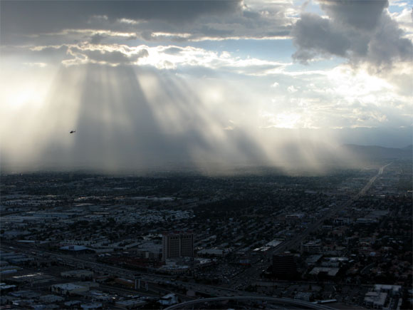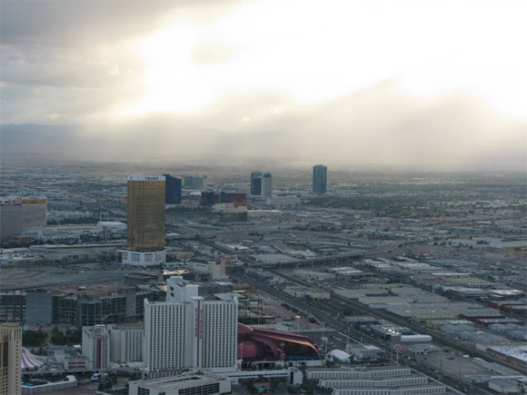 Забрались на "Стратосферу" - ну как без нее... Картинка забавная: слева - голубое небо, справа - лупит дождь.