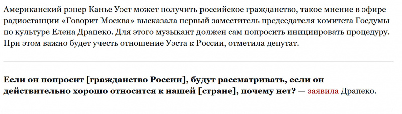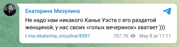 Доносчица Мизулина, она же глава помойки под названием "Лига безопасного Интернета", заявила, что "не надо нам никакого Канье Уэста", не пояснив, кто такие "мы" - "Лига безопасного Интернета", что ли? Так Уэст прилетел и не к ним.