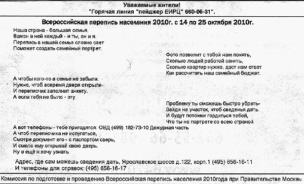 Страна готовится к Всесоюзной переписи населения. Под это дело в ЕИРЦ разыскали ту самую тетку, которая пишет жуткие вирши для свадеб и похорон, и заказали ей остихотворить информацию о переписи. Прислал Дмитрий Д, за что ему огромное спасибо. Читайте! Рыдайте!