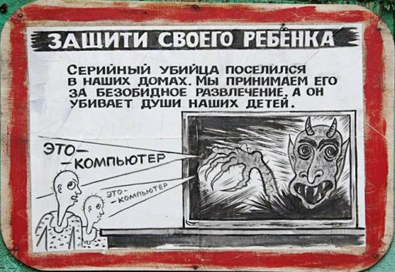 Правда, вместо компьютера безвестный художник изобразил телевизор, в котором идет передача о вреде пьянства, но, может, он просто компьютер и в глаза не видел? Или у него белая горячка.