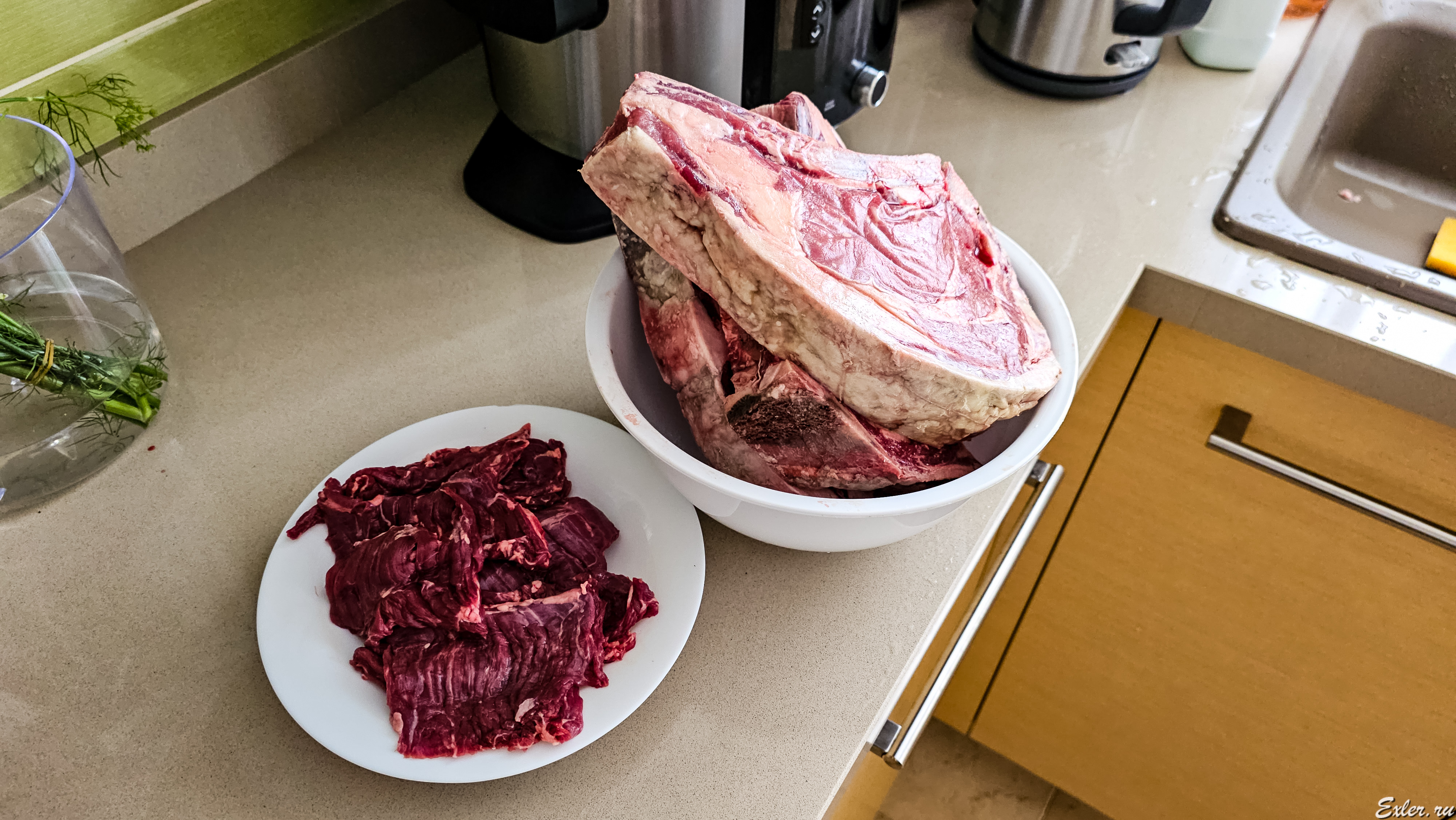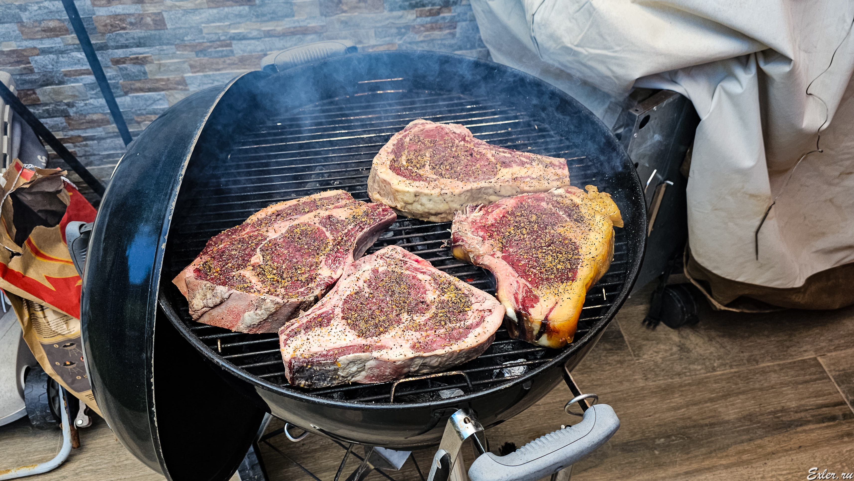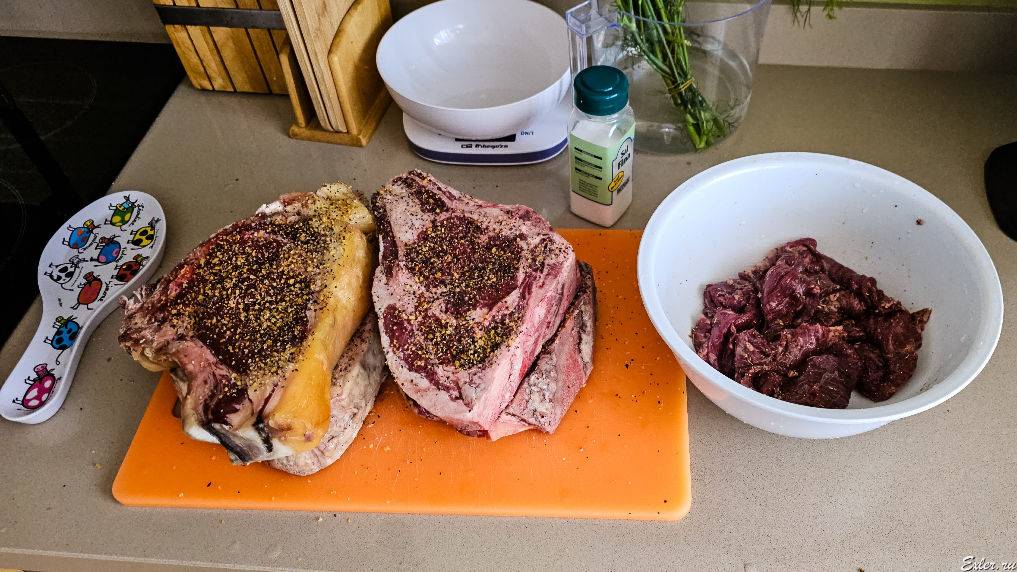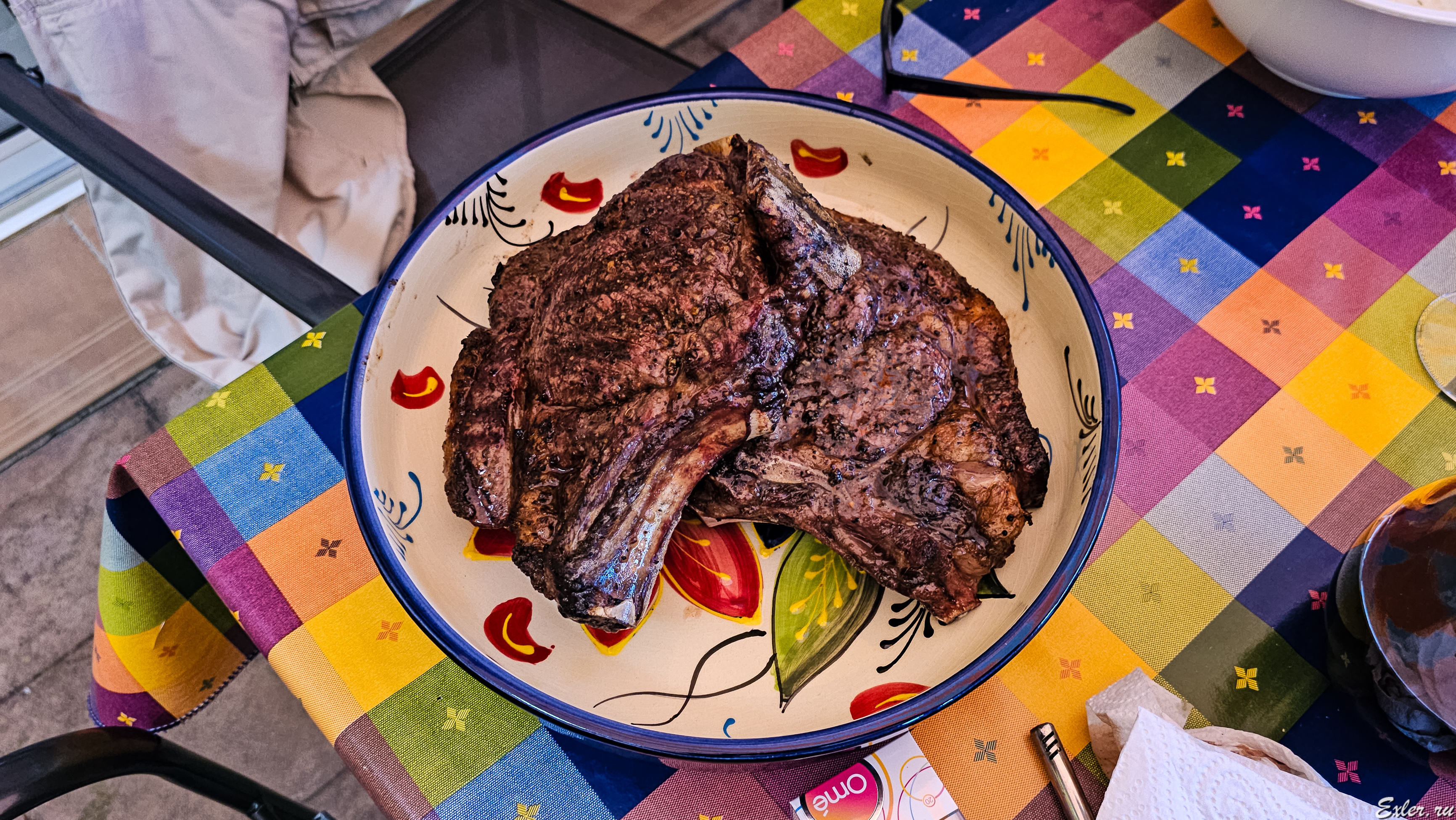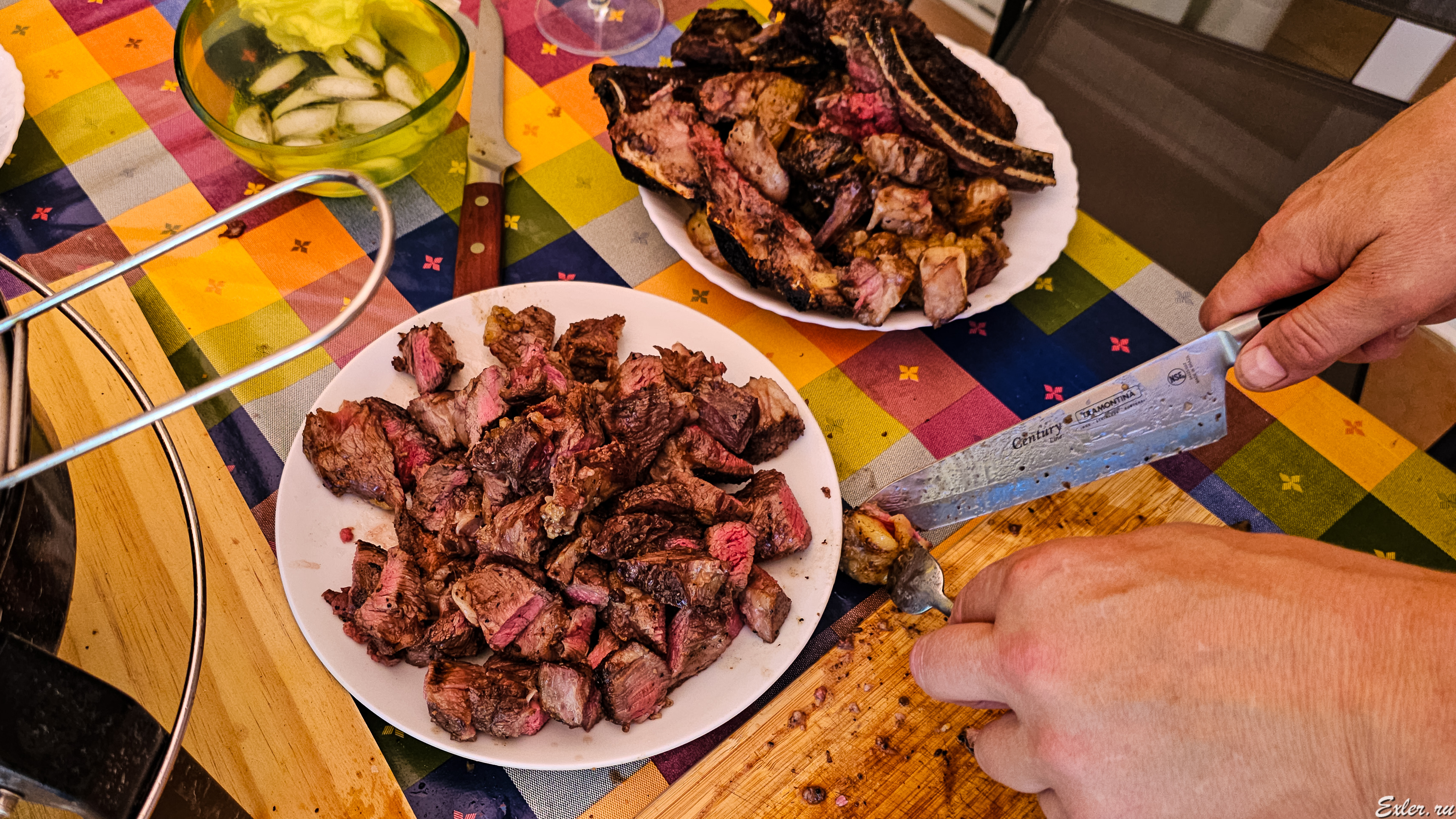 Вчера друзья в гости приходили - было что обмыть, - ну и немножко приготовили разного мяска. Я купил три килограммовых чулетона из быка семментальской породы, также купил кило энтраньи - очень люблю это дело.