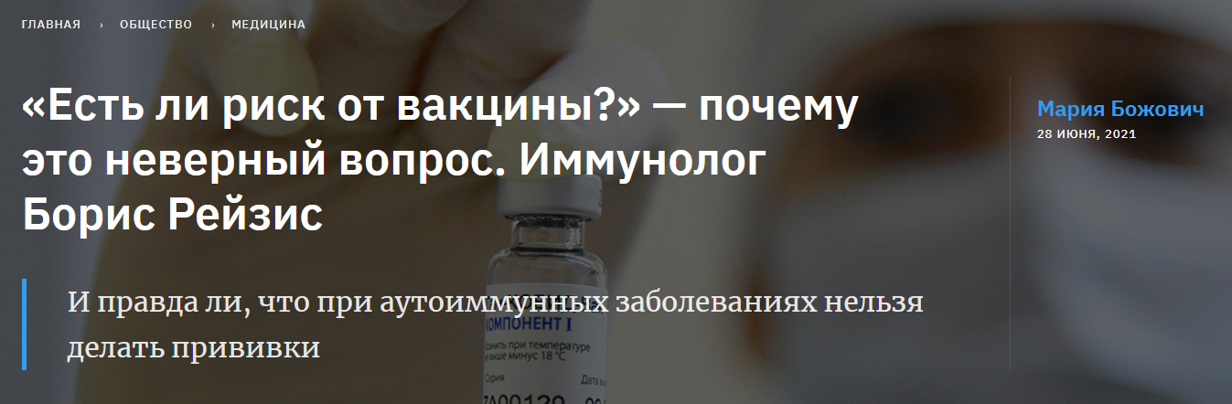 На мой взгляд, толковое интервью с иммунологом Борисом Рейзисом, профессором Нью-Йоркского университета (NYU): о том, какие могут быть риски прививки от ковида - "«Есть ли риск от вакцины?» — почему это неверный вопрос. Иммунолог Борис Рейзис".