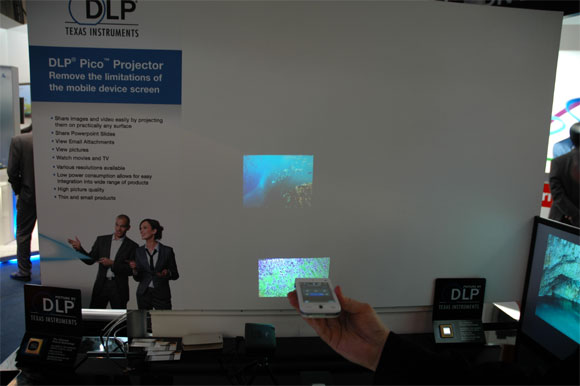 На стенде Texas Instuments показывали различные DLP-технологии. Особенно впечатлил проектор в телефоне, который к тому же еще и неплохо показывал. На снимке проекция сверху - это из телефона.