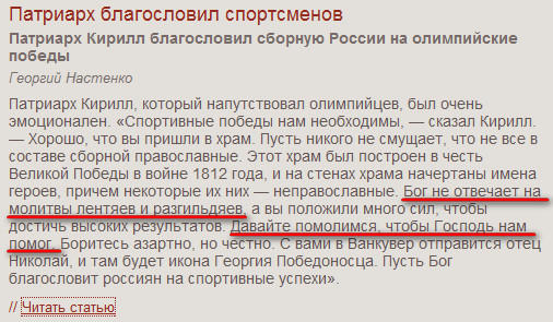 Так что или не те молились, или просто тщательно благословленный во все места спортсмен выступает значительно хуже, чем безо всякого благословения. Ничего личного, просто чистая практика.