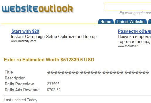 Очередной сервис, якобы измеряющий стоимость сайтов. Exler.ru оценили неплохо. Можно под него кредит брать. На покупку мопеда.