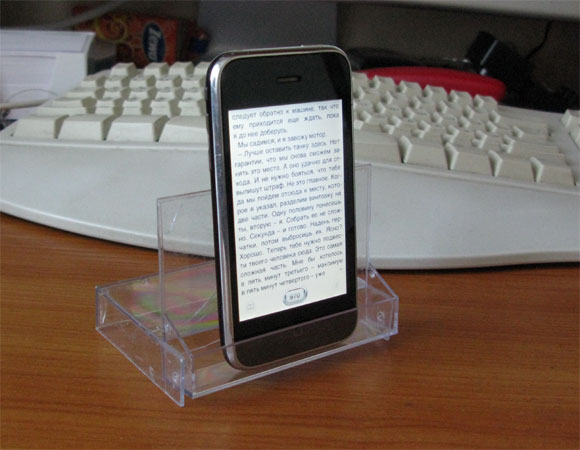 Я уже давно ищу подставку для iPhone, позволяющую читать устройство за едой - журналы не всегда есть под рукой, а читаю я все именно на iPhone. И вот тут у Чер-ского увидел гениальную подсказку! Нужно просто взять коробочку от старой аудиокассеты! Слава богу, она у меня нашлась. И вот - ура, ура! - подставка готова! Годится она, разумеется, и для кучи других коммуникаторов/КПК.