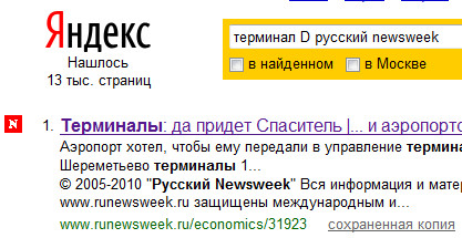 Искал сегодня на сайте "Русского Newsweek" статью о "Терминале D". В качестве поисковика там установлена Quintura - вообще хороший поисковик. Ввожу запрос "Терминал D". Получаю ссылку на одну статью о терминале D Таллинского порта. Ввожу запрос "Терминал" - получаю кучу ссылок, где упоминается это слово. Нужной статьи нет. Ввожу запрос "Шереметьево" - получаю ссылки на кучу статей и новостей. Нужной статьи нет.