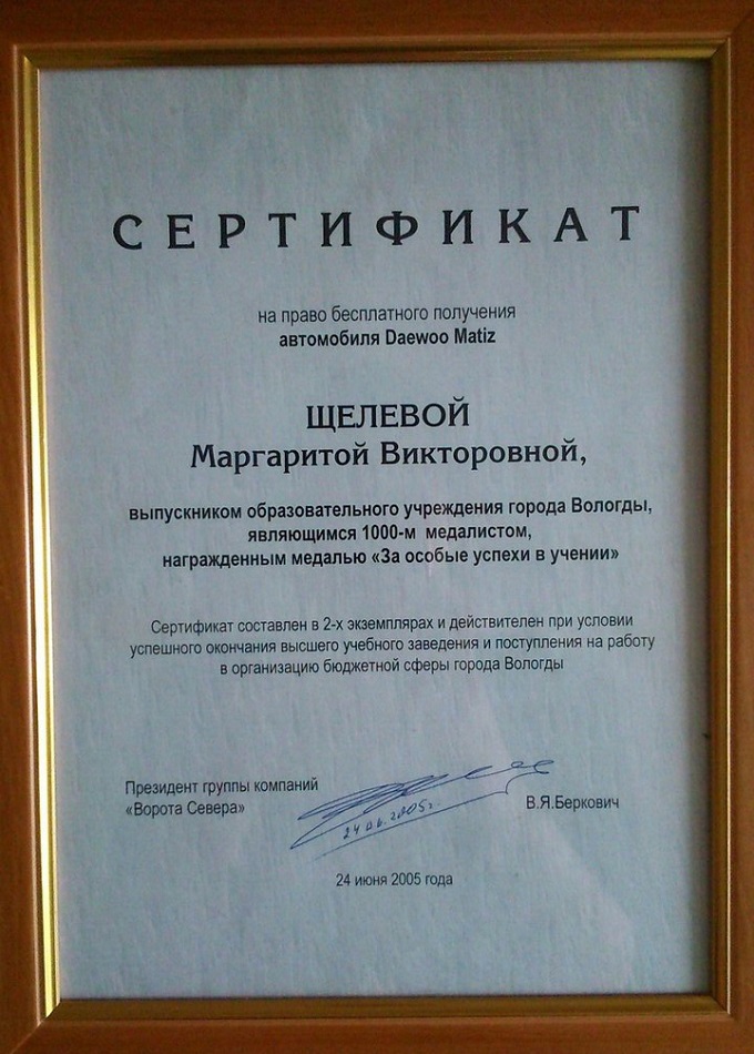 Совершенно потрясающая история. Пересказываю кратко. Жительница Вологды Маргарита Щелёва закончила школу с серебряной медалью. При награждении медалью глава города Якуничев торжественно вручил Маргарите (как тысячной медалистке) от компании "Ворота Севера" сертификат на автомобиль «Daewoo Matiz». Условие получения автомобиля - Маргарита после успешного окончания института должна была устроиться в бюджетную сферу Вологды.
