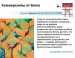 В "Коммерсанте-Деньги" статья "Коммерсанты от блога", в которой автор Владимир Боровой рассуждает о том, как монетизируются блоги на Западе и у нас. И приходит к выводу, что у нас блоги, в отличие от Запада, практически не монетизируются. Далее в статье делается вывод о том, что, мол, даже самые популярные российские блоги не в состоянии принести своим владельцам более $100 тысяч в год. (Что, конечно, чистая правда.)