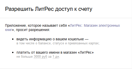 Слышь, "Литрес"! А губешка у вас не треснет - получать информацию о балансе, статусе, да еще и привязанных картах? Да и с какого бодуна я вдруг должен разрешать вам платить от моего имени?!! Вы что - совсем офигели?!!
