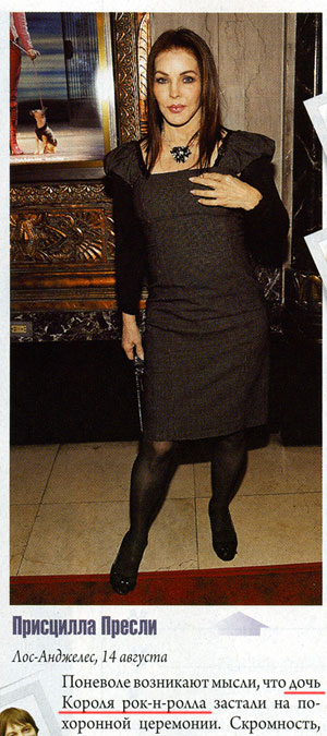 Я, конечно, понимаю, что Элвис умер в прошлом веке, а Присцилла для своих почти 120 лет очень даже прилично выглядит, но зачем называть жену Короля его дочерью? Они бы еще сказали, что Присцилла была замужем за Майклом Джексоном. Хотя всем давно известно, что она была замужем за Фрэнком Дребиным из полицейского взвода.