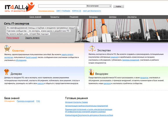 Фирма Softkey запустила интересный, на мой взгляд, проект - социальную сеть IT-экспертов IT4ALL. Это сеть для: производителей софта, для поставщиков, дилеров и интеграторов, для независимых экспертов и корпоративных пользователей программного обеспечения. Вот подробная информация.