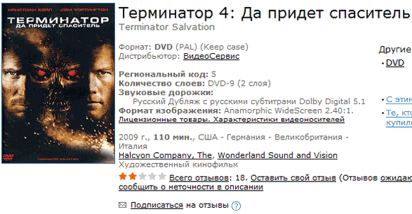 Огромное спасибо компании "Видеосервис" за совершенно потрясающее лицензионное издание "Терминатор 4". Ну, что там нет оригинальной дорожки - это еще ладно. Но что эти уроды альтернативно одаренные снабдили фильм неотключаемыми русскими субтитрами (которые еще и не совпадают с русским дубляжом) - за это такое огромное спасибо, что и не передать. Совсем уже долбанулись, кретины...