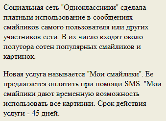 P.S. Причем заметьте, они сделали платными использование смайликов, которые разрабатывали совершенно другие люди, и на использование которых у "Одноклассников" никаких прав нет. Чудесные ребята, просто чудесные! Сперли смайлики, а теперь их продают. Бижнесмены!