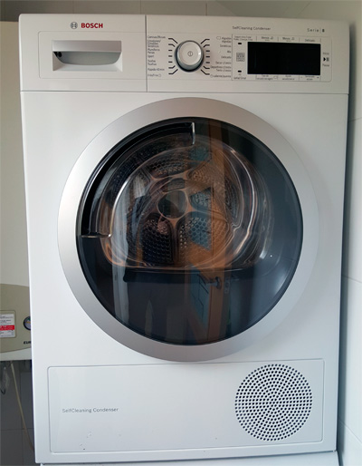 С маркой вопросов не было - Bosсh, только Bosсh. Мы обычно только Bosсh и покупаем и никогда нас эта марка не подводила. Но вот с моделью - были вопросы, потому что за последнее время в этой области придумали машины с так называемым тепловым насосом. Там вместо тэнов стоит испаритель и конденсатор, а компрессор гоняет между ними хладагент, как в кондиционере или холодильнике. Такая сушилка потребляет втрое меньше электроэнергии (а в Европе электроэнергия дорогая), а главное - при работе воздух вокруг не нагревается и нет парникового эффекта.