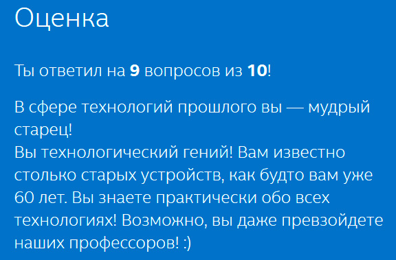 У меня вот такой результат - комплиментарный. Я не просто стар. Я суперстар! Только с копировальной машиной ошибся, но там как раз вопрос составлен очень некорректно.