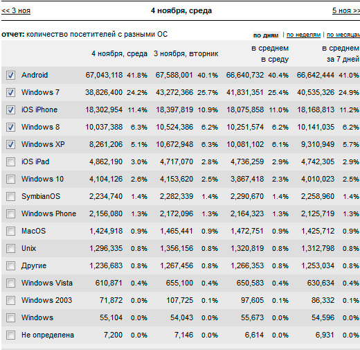 Ну, интересно. Я почему-то считал, что iOS занимает бОльшую часть рынка. Однако давайте сравним эти данные с неумолимой статистикой Liveinternet по зоне RU (охват - примерно 20% сайтов всей зоны), например, за вчера.