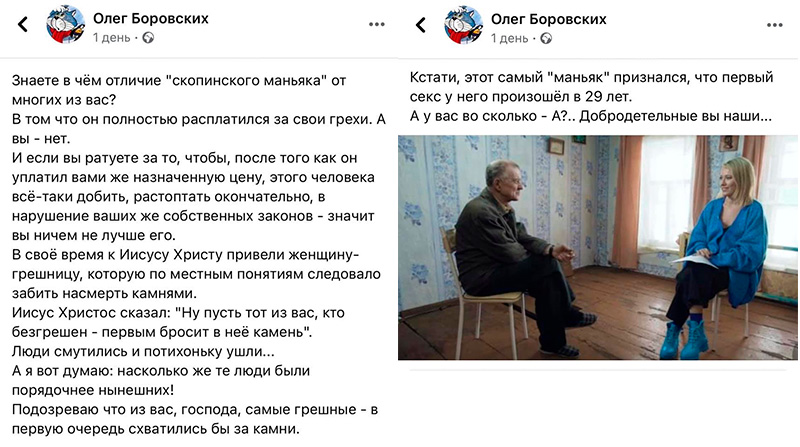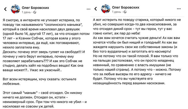 А вот вполне закономерный результат этой прелестной передачки. И насиловал не совсем уж и детей, да и вовсе младенец невинный. Видел еще заявление аналогичного уродца, который сказал, что на самом деле изнасилований было всего два, потому что все что после этого - они уже, дескать, привыкли. Всегда интересно было, что у таких людей в мозгах (включая этого Олега) и как они вообще живут с подобным дерьмом в голове.