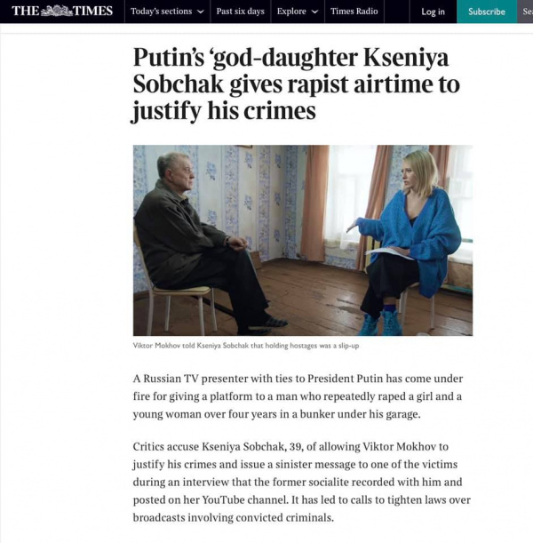 Забавно. Пока "лидеры мнений" и медийные персоны с пеной у рта спорили о передаче Собчак со скопинским маньяком и о том, как это вообще назвать, в The Times просто назвали вещи своими именами - заголовок: "Крестница Путина Ксения Собчак предоставила эфир насильнику для оправдания преступлений". Ну да, только так это и называется, никак не иначе.