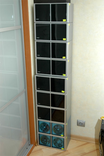 Насчет же хранения дисков... Самый лучший и недорогой вариант - боксы HIPCE с выдвигающимися лотками на 160 DVD. Боксы нумеруются, конверты в них пронумерованы. Информация о фильмах заносится на комп с помощью какой-нибудь программы (я использую AllMyMovies) и там вбивается номер бокса и номер конверта. Нужный фильм при этом отыскивается за 15 секунд. Стоимость хранения - примерно 6 рублей на диск. У меня так хранится примерно 2500 фильмов.