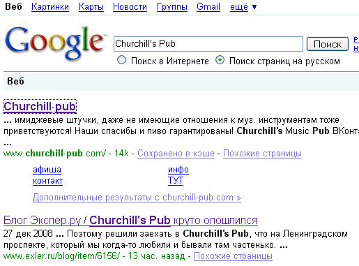 Забавно. Вчерашняя запись про Churchill's Pub в русскоязычном Гугле уже на втором месте. Причем обгоняет информацию о самом пабе, потому что на первом месте - сайт совершенно другого Churchill's Pub, харьковского. А в Яндексе эта запись пока на 31 месте. Причем туда попала копия записи из ЖЖ, а из Exler.ru ее там вообще нет, не проиндексировано. Странно. Понаблюдаю еще дня три - интересно, как ситуация будет меняться...