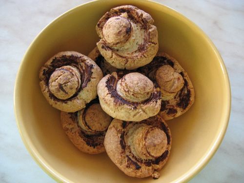 Но на самом деле это печенье такое. Заготовки из теста засовывают в бутылочное горлышко - получаются вот такие шампиньошки. Потом запекаются. Выглядит очень забавно.