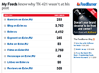 Вчера те пользователи, которые следят за обновлениями на Exler.ru через RSS-ленту, пожаловались на то, что штук 20 старых анонсов продублировались. RSS-подписка на мой сайт идет через FeedBurner (c его помощью можно собирать статистику подписчиков). А он продался Google и теперь называется feedburner.google.com. Вчера мне FeedBurner радостно сообщил, что по моей просьбе (которой не было) перенес данные моих RSS-потоков на мой аккаунт в Google (причем я пока совершенно не понял, как он вообще узнал о наличии данного аккаунта - я не вносил эти данные в свою регистрацию на FeedBurner). Поэтому последние 20 записей и продублировались, приношу свои извинения за это невольное дублядство.