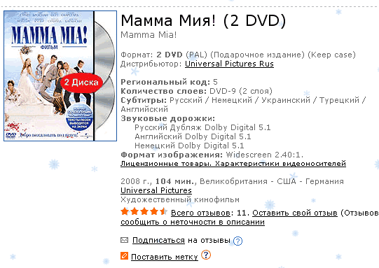 Да, ну и еще должен заметить, что допы к фильму - на первом диске. На втором диске - повторяется тот же самый фильм, только с одной оригинальной дорожкой и безо всяких субтитров. Единственное, что его вроде как отличает - в момент исполнения песен можно включить режим караоке. Изобразить из себя блистательную Мэрил Стрип. Ну или, если вам слон наступил на ухо и вы гундошник по жизни, тогда изобразите из себя Пирса Броснана. Он такой же.