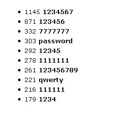 А вот царица полей - Top10 наиболее часто используемых паролей. И если ваш пароль находится в этом списке - вы спокойно можете считать себя идиотом.