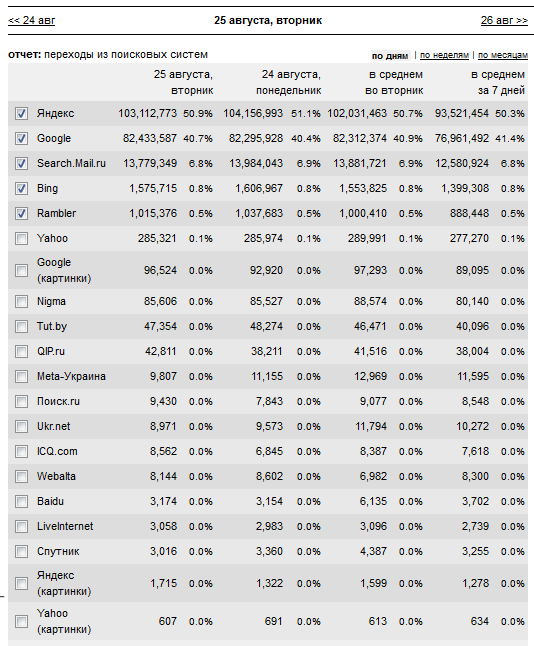 Залез в статистику - посмотреть доли переходов с различных поисковиков. Статистика LiveInternet для зоны RU на вчерашний день (счетчики установлены где-то на 20% сайтов, выборка достаточно репрезентативная).