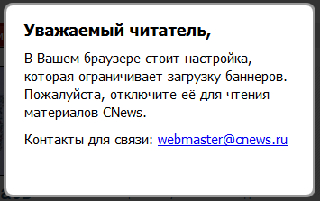 Рассказали тут мне хохму про CNews. Я не поверил, но решил проверить. Установил себе AdBlock (так-то я его не использую никогда). Зашел на CNews. И правда - получил вот это. Это при том, что AdBlock у меня просто установлен, но ничего не блокирует.