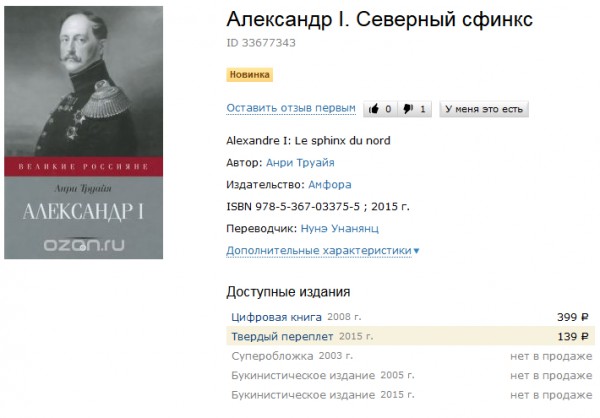 Евгений Плисс обнаружил большую библиографическую редкость. На "Озоне" продается редчайшая книжка об Александре I. При этом хохма в том, что на обложке изображен Николай I.