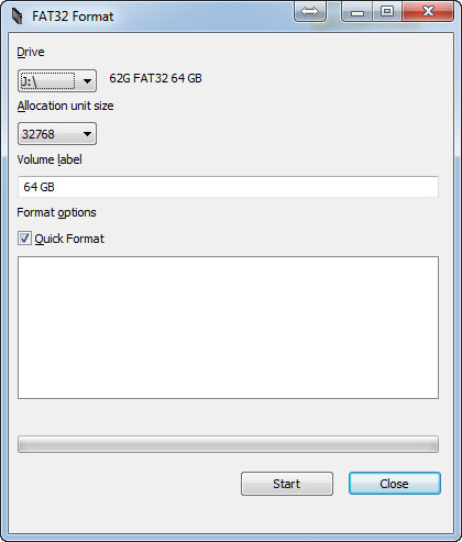 2. Скачиваем бесплатную программу Guiformat FAT32 (по ссылке версии для 32-битной и 64-битной Windows) и форматируем карту с параметрами по умолчанию. Она отформатирует ее в FAT32.