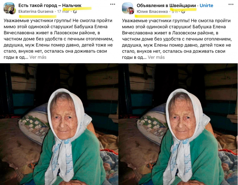 Уже года полтора прошло, пост этот сносили сотни раз, а он все всплывает и всплывает в самых разных пабликах. За бабушку беспокоятся Екатерина Кураева, Юлия Власенко, Мария Колядова, Елена Лисовская, Марина Беспалых, Ирина Колмановская, Лера Курбанова и прочие достойные дамы. У всех них мамы очень хорошо знают эту бабушку. Реквизиты только у бабушки обычно меняются, но она такая бабушка, шустрая.