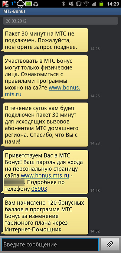Сижу дома, работаю, никого не трогаю. Вдруг в какой-то момент на телефон начинают приходить очень странные SMS от какого-то совершенно мне не известного MTS-Bonus. Вот они все.