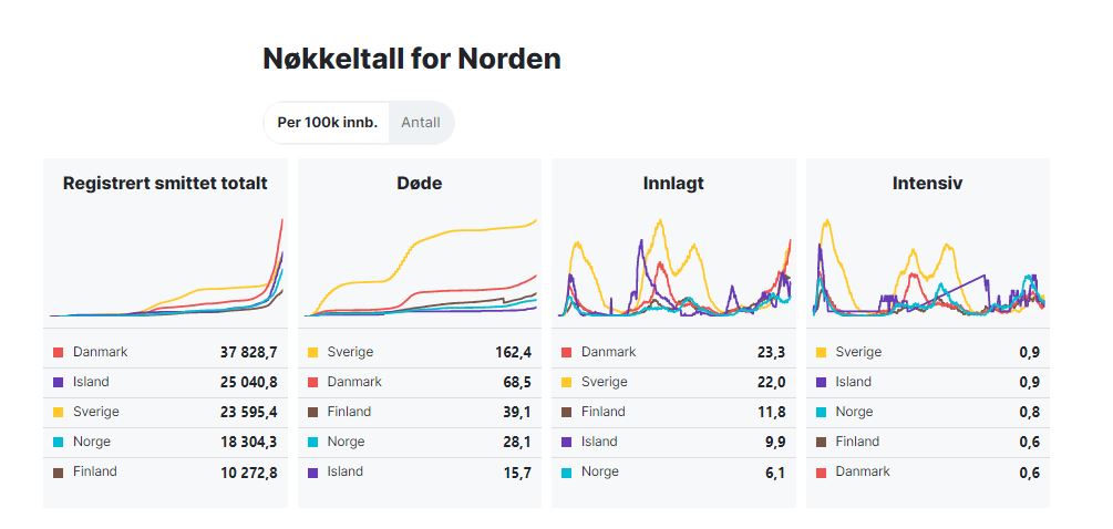 www.vg.noНу что. Я опять со своими данными по Скандинавии. Слева направо: количество заражений на 100 000 (брутто), количество умерших на 100 000 (брутто), количество госпитализированных на 100 000 (нетто в каждый текущий момент времени), количество людей в отделении интенсивной терапии на 100 000. Как можно видеть, никто так и не смог "догнать" Швецию по количеству смертей, хотя некоторые надеялись, что большое количество смертей в начале эпидемии будет означать меньшее количество смертей на более позднем этапе. Не будет. После появления вакцин графики всех скандинавских стран (кроме Исландии) стали очень похожи друг на друга. Но вот этот первоначальный разрыв так и остался. Тех, кто умер уже не воскресить. И это цена "невмешательства" и "свободы" в первые месяцы эпидемии. Стоило ли оно того - пусть каждый решает сам.Кстати, "спасения экономики" тогда НЕ произошло, экономика Швеции прошла через точно такой же кризис и восстанавливалась теми же темпами, каки экономики Дании, Финляндии и Норвегии.