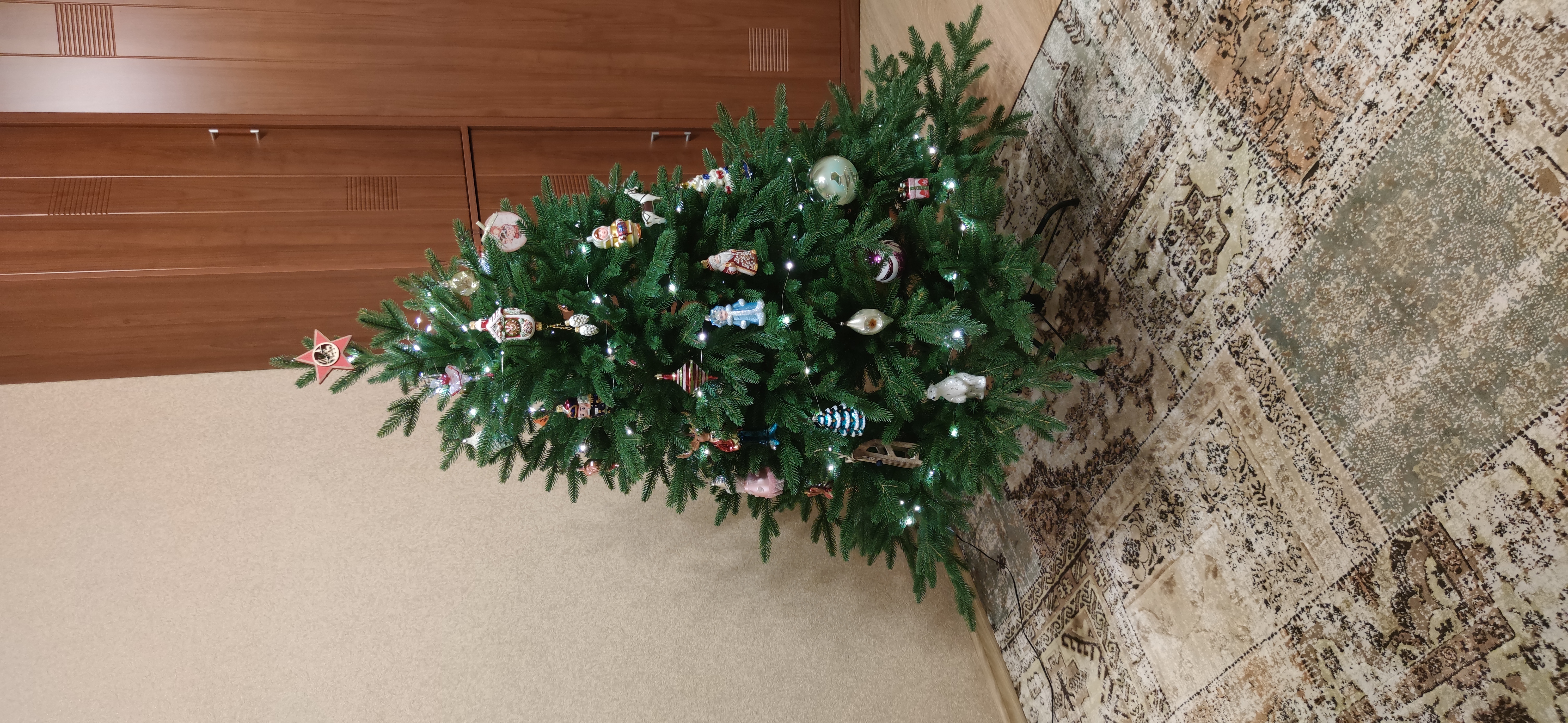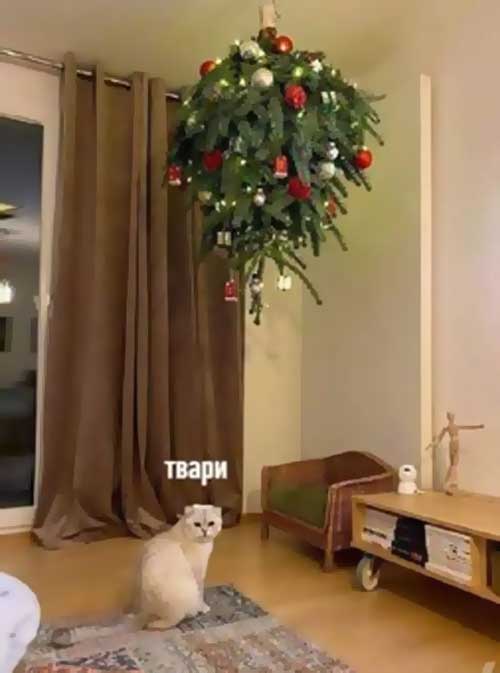 10 лет назад повесила впервые, чтобы щенок не достал)) И всё, прижилась ёлка на потолке))