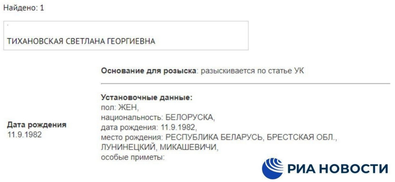 МОСКВА, 7 октября / Радио Sputnik. Бывшего кандидата в президенты Белоруссии Светлану Тихановскую объявили в розыск на территории России, соответствующие данные содержатся в базе данных МВД.Так, в карточке указывается, что белорусский общественный деятель разыскивается по одной из уголовных статей, однако ее номер не указывается.Тихановская в первые дни после президентских выборов в республике записала обращение к белорусам с призывом прекратить протесты и покинула территорию Белоруссии. (Отсюда.)