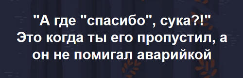 Автопроизводителям давно пора добавить сигнал и кнопку "спасибо". Чтоб не было разброда и шатания - кто аварийкой моргает, кто рукой машет, кто головой кивает, кто просто "спасибо" себе под нос бурчит.