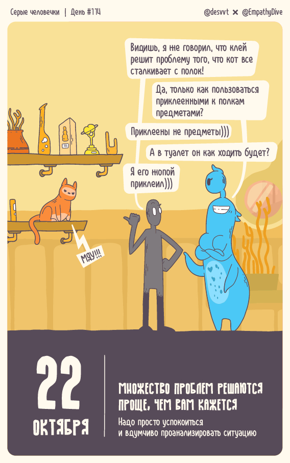 Кстати, по сюжету кот — представитель заказчика исследований. Но иногда он зарывается и тоже получает пендалей, как в этот раз. Иногда зарываются исследователи (вон те, синие) и получают от кота. В общем, жизнь весёлая.