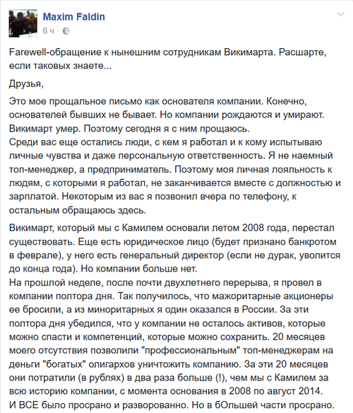 Но он пишет о себе как о основателе компании, и как о миноритарии. Если он с прошлого года не имеет отношения к управлению, и он видел к чему все идет - почему пост ФБ появился вчера?