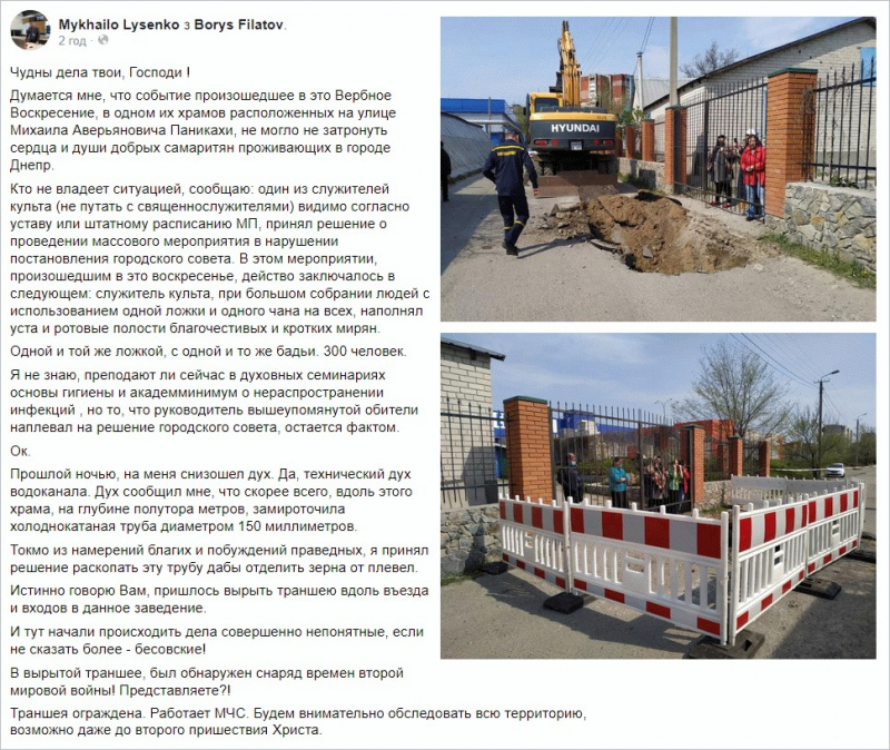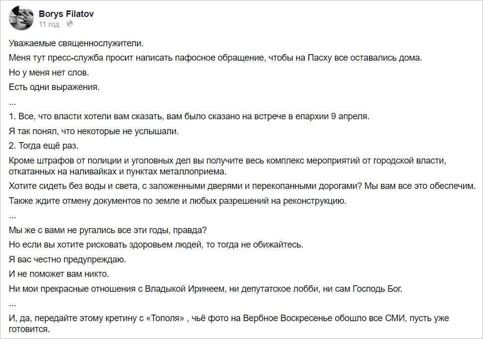 Что касается угроз - у всех церквей в Днепре единый руководитель, с которым у Филатова "прекрасные отношения". Если бы надо было припугнуть попов - достаточно было это озвучить лично.
