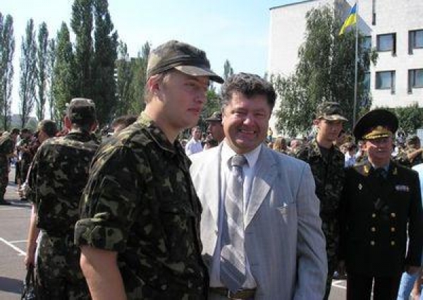 Одна мелочь. На фото присягу принимает Алексей Порошенко, сын бывшего президента Украины Петра Порошенко. Он слева на фото, немного в глубине. На сыне украинский камуфляж.