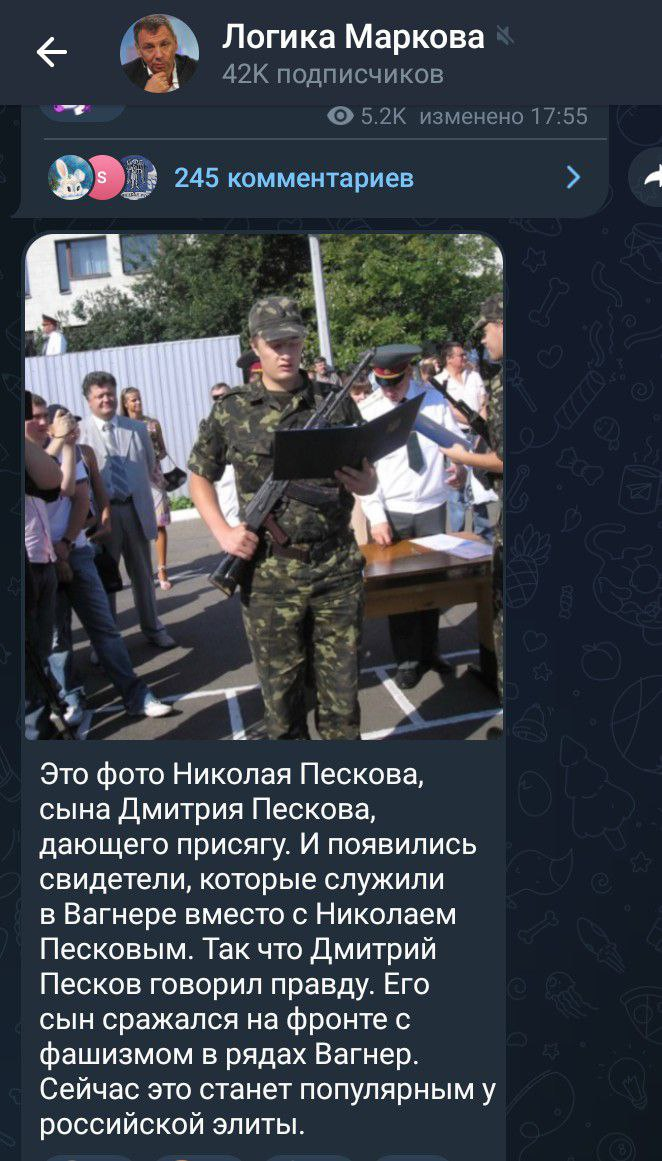 «Из всех моих знакомых один человек — Дмитрий Сергеевич Песков, который в свое время прослыл законченным либералом — своего сына, который часть жизни в Америке прожил по-моему, если не ошибаюсь, или в Англии… Пришел и говорит: „Забери его простым артиллеристом“. Кстати, отработал абсолютно нормально. Простым артиллеристом, по колено в грязи, говне, на „Урагане“. Мало кто об этом знает», — сказал Пригожин.