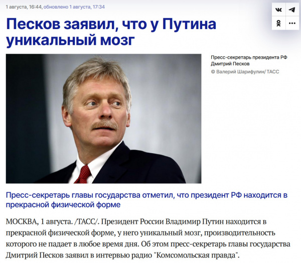 Пескова и вовсе не слышно с 1 августа, когда он заявил, что товарищ Путин так много работает, что не писает и не какает, так как у него всё перерабатывается внутри организма. И всё, пропал насмерть.