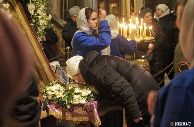 За тем, как в Казанском соборе соблюдают советы РПЦ, 12 марта следил фотограф «Фонтанки». К мощам выстроилась внушительная очередь, все желающие подходят к сосуду и целуют его. Рядом стоит девушка-волонтер, которая пытается после каждого подхода протирать сосуд, но поспевает она, заметил корреспондент, не за всеми.