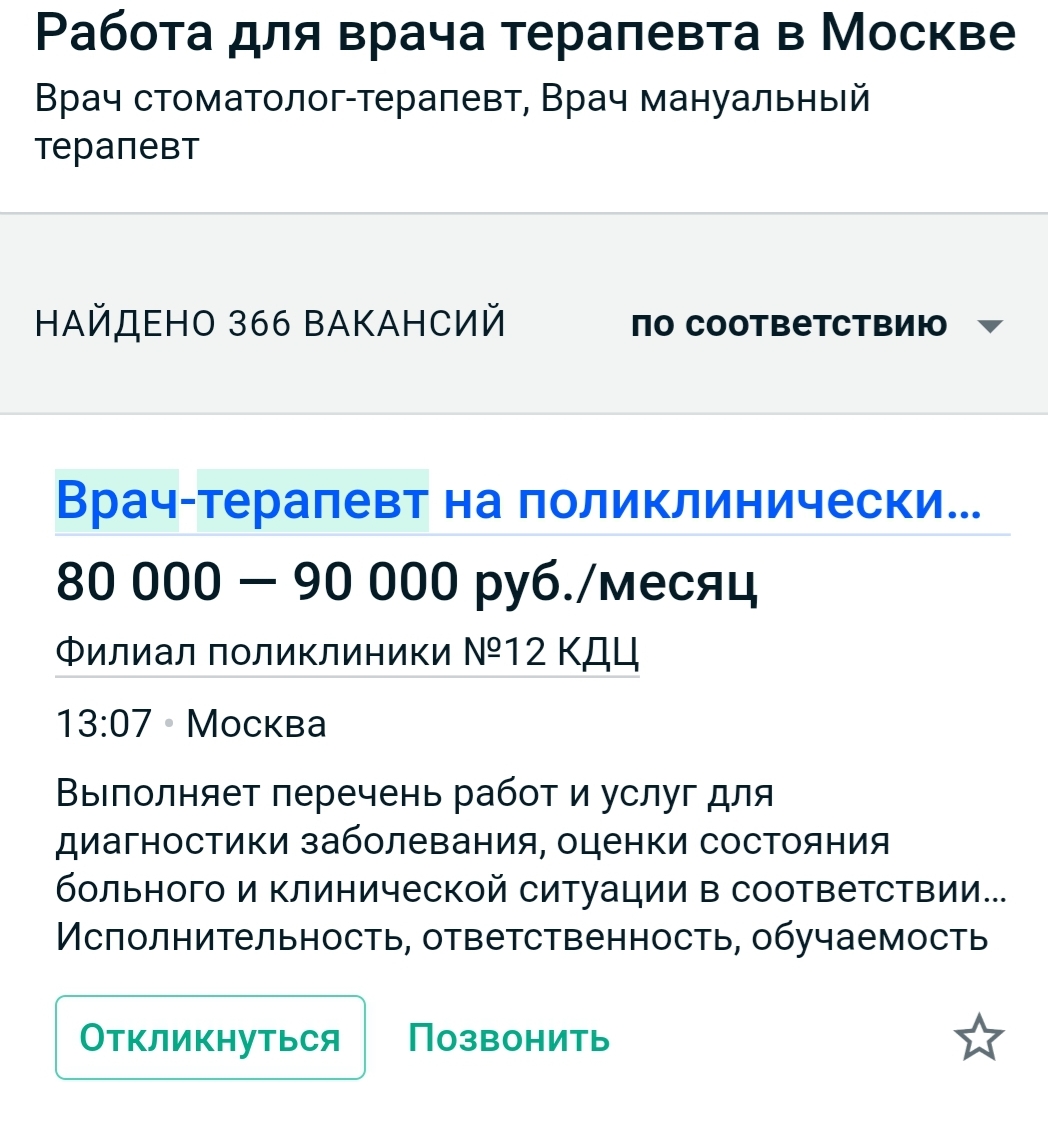 Зашел на Суперджоб, глянул первую попавшуюся вакансию, по врачам. Ну, приблизительно так, как мне и говорили. На фоне этого, зарплаты десятка телеведущих, лиц канала, на который жалуются и запрещают как сверхэффективный инструмент влияния, по всему миру, как то не выглядят запредельными.